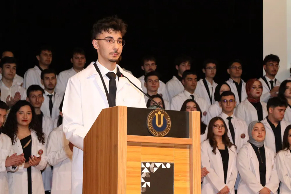 Müzik dinletisi başlayan programın açılış konuşmasını gerçekleştiren Tıp Fakültesi dönem 1 öğrencisi İsmail Emre Gürbüz, tıp eğitiminin sadece akademik bir süreç değil, büyük bir sorumluluk ve insanlık görevi olduğunu ifade ederek kendilerine rehberlik eden hocalarına ve her zaman yanlarında olan ailelerine teşekkür etti.